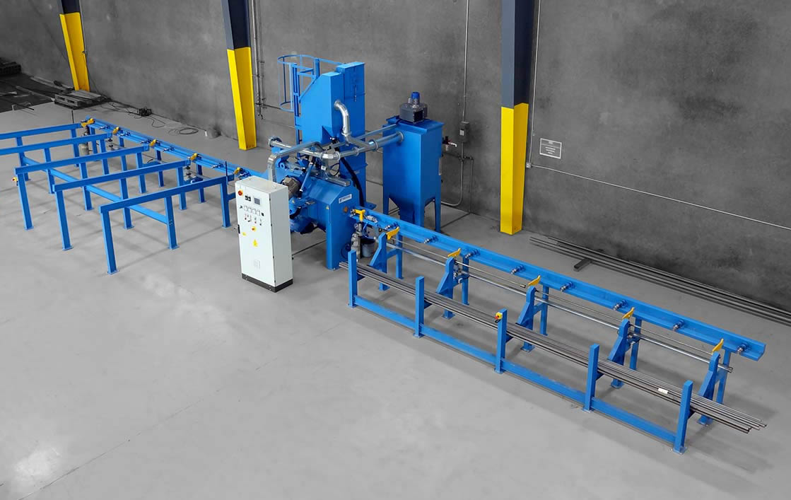 棒材拋丸機主要用于清理圓鋼、圓管、方鋼、鋼筋等型材,對工件表面進行清理和強化,除掉其上的銹層、焊渣及氧化皮,使之獲得均勻一致的金屬光澤,以提高鋼材的涂飾質量與防腐效果。公司針對用戶的生產狀況設計了兩款產品:單根清理拋丸機和多根清理拋丸機,這兩種棒材拋丸機都可以工件自動裝卸,自動化程度高,不需要人工搬運,提高生產效率,節約成本。為保證對清理工件的嚴格要求,我們在該拋丸機的方案和設計中采用下述關鍵技術及保證措施: