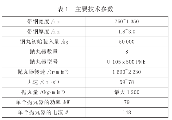 熱軋硅鋼帶在進行冷軋以前,一定要進行酸洗。酸洗的目的是除鱗、去氧化層。對硅鋼帶,一般采用拋丸酸洗法。拋丸的目的是對帶鋼表面進行連續(xù)除鱗,帶鋼表面經(jīng)丸粒連續(xù)打擊,使表面氧化鐵皮松落,從而提高酸洗效果。首鋼某常化酸洗機組用于為下游的二十輥機組提供合格的原料鋼卷,主要生產(chǎn)無取向高牌號硅鋼和取向硅鋼,該機組在其酸洗槽入口設(shè)置了拋丸機,該拋丸清理機是由 DISA 公司設(shè)計制造。以下主要對拋丸機的設(shè)備結(jié)構(gòu)進行分析。