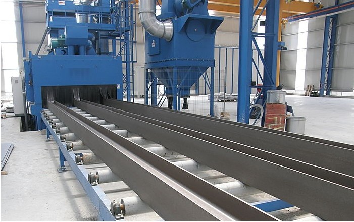 輥道通過式拋丸清理機是將工件吊放在輸送輥道上,輥道輸送系統將工件向前輸送,當工件進入清理室時,拋丸器開始順序工作。經過拋丸處理后,鋼材表面的氧化皮、污物及其它附著物被清理干凈,處理過的表面可達Sa2-2.5級。拋丸機的工作方式是連續循環進行的。