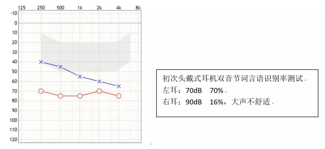 這是一例典型的非對稱性聽力損失案例。從聽力康復的基礎資料來看,雖然右耳突發性聽損遺留重度聽力損失和非常差的言語識別率,幸運的是左耳雖然聽力損失時間長,但程度較輕,言語識別率測試結果也較好,因此對于未來的康復效果也有較好的預期。