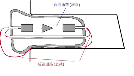當麥克風拾取到受話器發出的聲音時,這些聲音會進入受話器被二次放大,從而形成聲音的反饋環路。嘯叫是在聲反饋基礎上產生的一種可聽見的聲音振蕩(audible oscillation),只有當聲音反復進入反饋環路、重復被放大時,才會出現嘯叫。