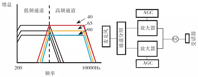 其二,環境噪聲和信號的主要能量分別處于不同的頻率。人們生活在復雜多變的聲音環境中,有大聲、小聲,還有高頻聲、低頻聲,弱聽人士對各種性質聲音的感知和需求是不同的,因此要求助聽器不僅能分別處理小聲、正常對話聲和大聲,還應該能對不同頻率的小聲、正常對話聲和大聲有區別的放大或抑制。多通道助聽器就能完成這一目標,能適應不同增益和壓縮的需求,因此具有很高的靈活性。