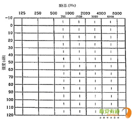 純音測試聽力圖的橫坐標為頻率,從左至右表示測試聲的頻率從低到高,即125Hz至8000Hz;縱坐標為強度,從上至下表示受試者能聽到的最小的聲音強度,以dBHL為單位。如下圖所示: