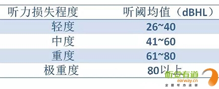 按照世界衛生組織(WHO)1997年的標準,根據0.5kHz、1kHz、2kHz、和4kHz氣導平均聽閾值,將聽力損失分為輕度、中度、重度和極重度。