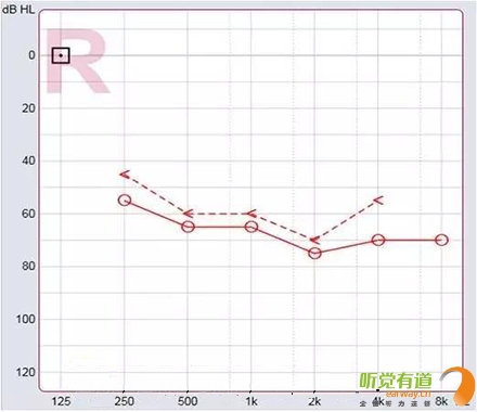 氣骨導一致(≤10dB)且都在正常范圍之外為感音神經性聽力損失。表明聽力下降是由耳蝸、聽神經損傷引起。