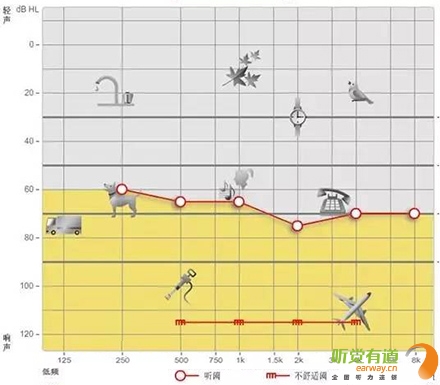 小聲聽不到,大聲受不了是重振現象。以下圖聽力曲線為例,“飛機”處于不舒適閾附近,聽力損失者對“飛機”的聲音聽著受不了。另外,該聽力損失者聽不到“手表”等聲音。