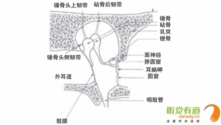 <span style="font-size:16px;"> 中耳結構包括鼓室、咽鼓管、鼓竇和乳突腔四部分。鼓室內有聽骨、肌肉、韌帶和神經。中耳是換能器,換能是將一種能量形式轉換成另一種能量形式,中耳通過鼓膜和聽骨鏈將聲能轉換為機械能,再由鐙骨底板將機械能轉換為內耳的液態能。</span></p><p><span style="font-size:16px;"> 鼓膜是中耳和外耳的分界,呈橢圓形,中間稍向內凹陷,色灰白,較透明,與耳道底約呈30°角。鼓膜寬約8mm,高約9mm,厚0.1mm,質地韌,其構造分三層:外層是皮膚層,中層由淺層的放射狀和深層的環狀纖維組成,它們使得鼓膜能承受一定的氣壓和水壓并抗感染,內層為粘膜層,與鼓室粘膜相連續。聲音的振動,即聲能,通過耳郭和耳道共振的加強,引起鼓膜隨之振動,鼓膜與中耳的錘骨相連,在正常耳,錘骨懸掛在自鼓膜頂端至下2/3處。錘骨柄的尖端將鼓膜頂向中耳,形成錐形鼓膜的頂,稱作臍。自臍向前下達鼓膜邊緣有一個三角形的反光區,名光錐,是外來光線被鼓膜的凹面集中反射而成。鼓膜下4/5為緊張部,上1/5由于缺乏纖維層而較松馳,稱為松弛部。鼓膜可分為前上、前下、后上、后下四個象限。兒童的鼓膜薄而有彈性,年齡越大,鼓膜越厚且越僵硬。鼓環將鼓膜固定在某一位置,使其成為在外耳和中耳之間的一層防水防氣的屏障。</span></p><center><span style="font-size:16px;"><img alt="" src="/upfiles/201810080137189845.png" width="440" height="250" /></span></center><p></p><p><span style="font-size:16px;"> 中耳鼓室</span></p><center><span style="font-size:16px;"><img alt="" src="/upfiles/201810080137242362.png" width="440" height="250" /></span></center><p></p><p><span style="font-size:16px;"> 正常鼓膜像(左)</span></p><p><span style="font-size:16px;"> 在中耳腔內的聽骨是人體最小的骨頭,分別叫作錘骨、砧骨和鐙骨。這些聽骨由韌帶連接并懸掛起來形成了聽骨鏈。錘骨柄附在鼓膜上,錘骨頭與砧骨頭形成錘砧關節,砧骨底與鐙骨頭形成砧鐙關節,鐙骨底板由環狀韌帶固定在卵圓窗上。聽骨鏈利用杠桿原理使來自鼓膜的機械能放大,傳遞到卵圓窗。</span></p><center><span style="font-size:16px;"><img alt="" src="/upfiles/201810080137303051.png" width="440" height="250" /></span></center><p></p><p><span style="font-size:16px;"> 聽骨鏈</span></p><p><span style="font-size:16px;"> 咽鼓管是中耳通氣引流的唯一途徑,也是中耳感染的主要途徑。它的一端開口在較高的中耳鼓室腔,另一端開口在較低的鼻咽部,通過咽鼓管在鼻咽部的開口,空氣可從外界直接進入中耳腔。咽鼓管平時處于關閉狀態,能較好的防止細菌感染,只有在咳嗽、擤鼻涕、打哈欠或吞咽時,咽鼓管才開放。當咽鼓管開放時,根據鼓膜外側的壓力情況,空氣或者從中耳流向外界,或者從外界流向中耳,使中耳壓力得以平衡。</span></p><p><span style="font-size:16px;"> 更多詳情請登錄m.chisha.net.cn</span></p>" />