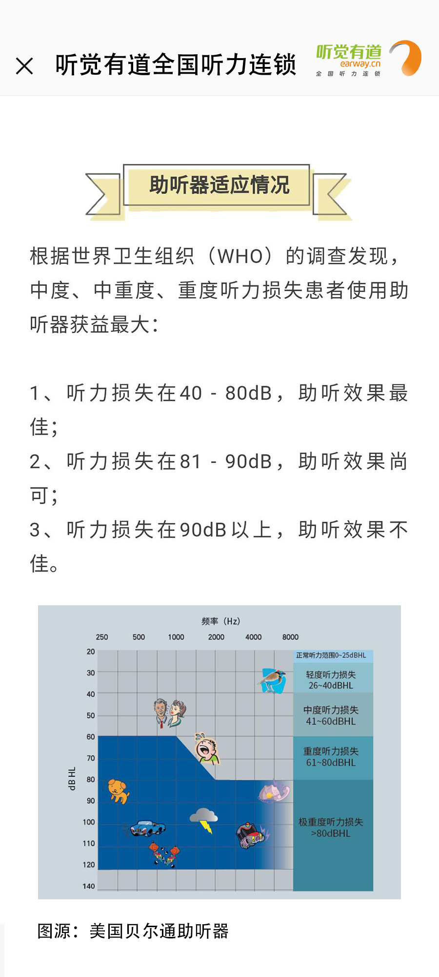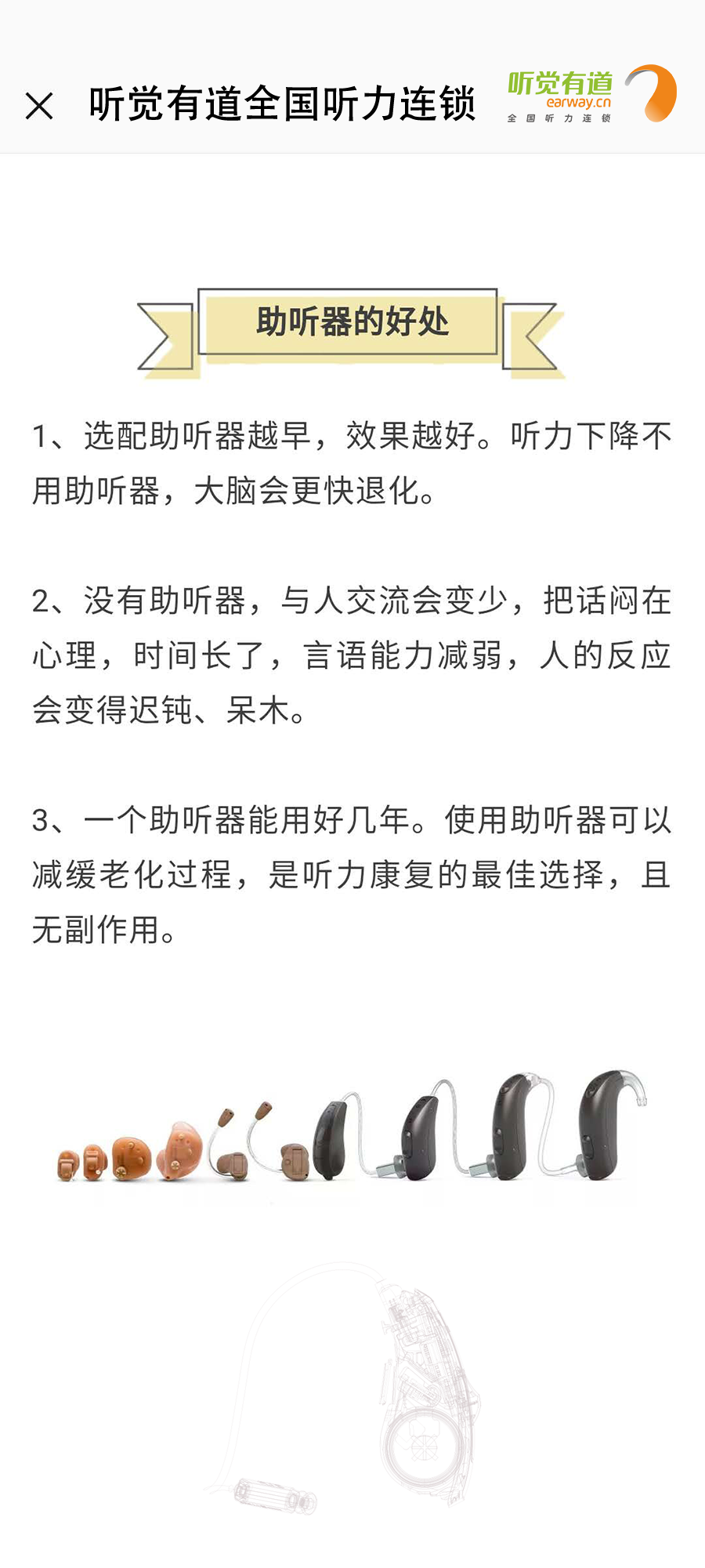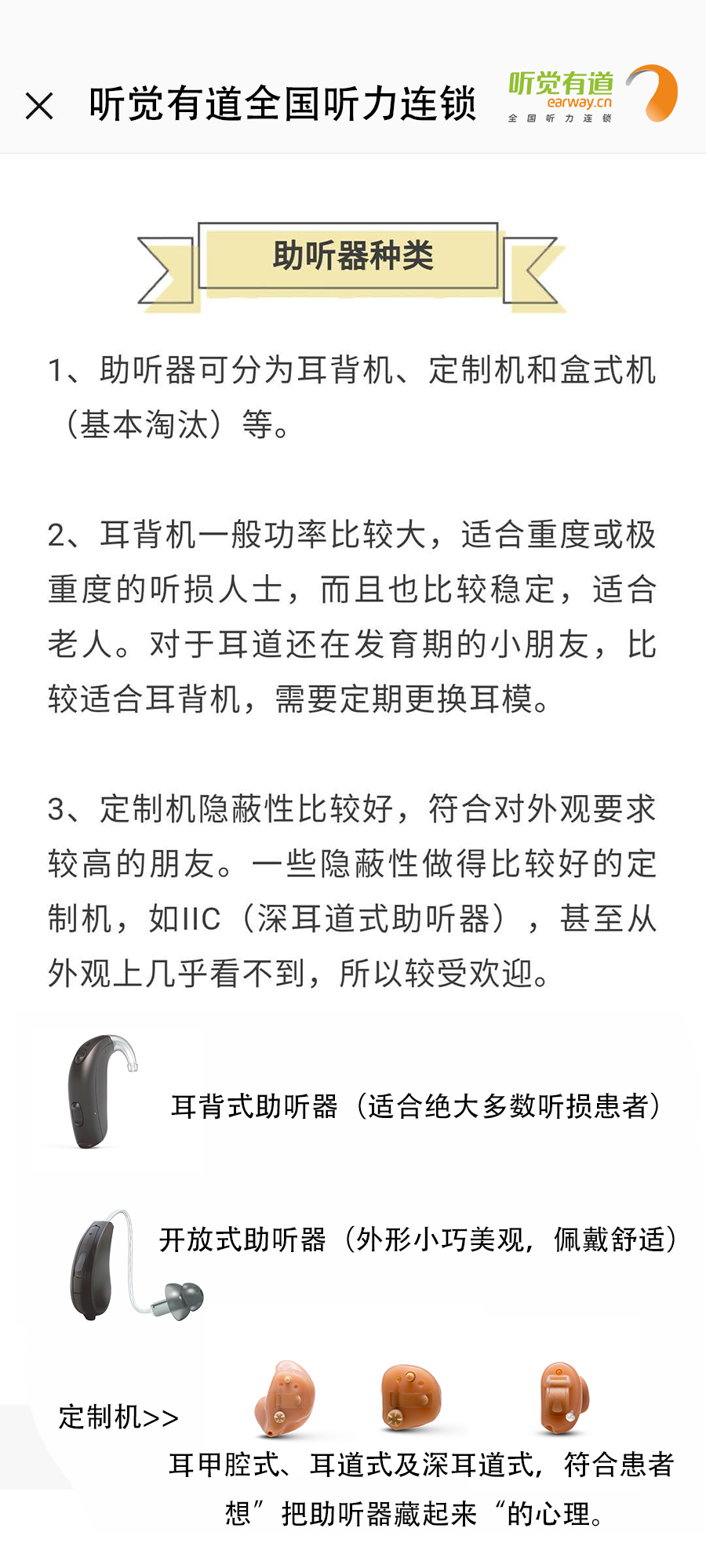 什么是助聽器?長什么樣子?有什么作用?如何使用?這里一一告訴您!</p><p> 助聽器是聽力障礙者使用的輔具,用來補足聽力損傷所造成的缺陷。廣義上講凡能有效地把聲音傳入耳朵的各種裝置都可以看作為助聽器,狹義上講助聽器是一個電聲放大器,通過它將聲音放大,使聽障者聽到了原來聽不清楚、聽不到的聲音。</p><p> 第一:助聽器的種類</p><p style="text-align: center;"><img src="/upfiles/201901180318143583.jpg" width="640" alt="" /><br /></p><p> 第二:助聽器的好處</p><p style="text-align: center;"><img src="/upfiles/201901180318334139.png" width="640" alt="" /><br /></p><p> 第三:如何適應助聽器</p><p style="text-align: center;"><img src="/upfiles/201901180318506440.jpg" width="640" alt="" /><br /></p><p> 第四:選配助聽器流程</p><p style="text-align: center;"><img src="/upfiles/201901180319039646.jpg" width="640" alt="" /><br /></p><p style="text-align: center;"><br /></p><p> 更多詳情請登錄m.chisha.net.cn</p>" />