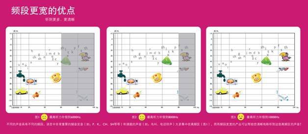 如上圖所示:高頻區域包含了較多的語言信息,尤其是“f”、“s”、“th”等輔音,這些輔音對于語言清晰度起到至關重要的作用。寬頻技術的助聽器可以很好地補償6000~10000Hz的聽力損失,較傳統助聽器音頻增加60%,極大地提高的言語清晰度。