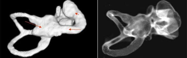 先天性內(nèi)耳畸形的疾病種類繁多,診斷比較困難,隨著高分辨CT和磁共振(MRI)的應(yīng)用,目前診斷率不斷提高。臨床常見的內(nèi)耳畸形包括大前庭導(dǎo)水管綜合癥、先天性耳蝸畸形、米歇爾聽障及沙伊貝聽障。本篇將后三種畸形介紹如下:</p><p> 先天性耳蝸畸形(Congenital cochlear malformation)</p><p> 先天性耳蝸畸形又稱Mondini內(nèi)耳發(fā)育不全,是最常見的一種內(nèi)耳畸形。</p><p> 1、病因</p><p> 本病可為常染色體顯性或隱性遺傳病,也可為非遺傳性因素,如風(fēng)疹病毒感染、過多的放射線暴露以及反應(yīng)停類藥物等引起。</p><p> 2、臨床表現(xiàn)</p><p> 先天性耳蝸畸形包括耳蝸扁平、耳蝸發(fā)育不良,特別是第二圈和頂圈發(fā)育不良,兩者合并為一個腔;前庭擴大,巨大的前庭導(dǎo)水管以及半規(guī)管畸形、內(nèi)耳道擴大等癥。在具體病例中不一定以上所有的畸形同時出現(xiàn),可僅出現(xiàn)其中一種或幾種畸形。</p><p> 3、聽力學(xué)表現(xiàn)</p><p> 出生即無聽力,或1~2歲時才出現(xiàn)聽力減退,主要為感音神經(jīng)性聽障,部分可為混合性聽障,有部分患者可長期保存殘余聽力。個別患者可有眩暈發(fā)作。</p><p> 4、診斷</p><p> 主要根據(jù)聽力學(xué)表現(xiàn)和影像學(xué)檢查。通過高分辨CT可看到耳蝸畸形。內(nèi)耳MRI顯示膜迷路內(nèi)水充盈,耳蝸扁平,耳蝸第二圈與頂圈間隔缺損,以及半規(guī)管、前庭的畸形。</p><p> </p><center><img alt="" src="/upfiles/201903250158493159.png" width="640" height="200" /></center><p></p><p> 先天性耳蝸畸形伴前庭和外半規(guī)管發(fā)育不良</p><p> 5、治療</p><p> 目前尚無有效的治療方法。如有殘余聽力,可佩帶助聽器后進行語言康復(fù)。無殘余聽力或極重度聽障患者可考慮人工耳蝸植入。</p><p> 米歇爾聽障(Michel’s deafness)</p><p> 屬常染色體顯性遺傳,是最嚴重的內(nèi)耳畸形,內(nèi)耳可完全未發(fā)育,可伴有其它器官的畸形和智力障礙。</p><p> 1、診斷</p><p> 主要依靠顳骨高分辨CT和內(nèi)耳MRI。</p><p> </p><center><img alt="" src="/upfiles/201903250158577271.png" width="640" height="160" /></center><p></p><p> 雙側(cè)內(nèi)耳畸形:左側(cè)無內(nèi)耳迷路及內(nèi)耳道機構(gòu),為米歇爾畸形;右側(cè)空耳蝸及前庭擴大,為先天性耳蝸畸形</p><p> 2、治療</p><p> 目前無特殊辦法,此類病例不適合行人工耳蝸植入術(shù),但是聽覺腦干植入術(shù)的適應(yīng)癥,其效果有待進一步證實。</p><p> 沙伊貝聽障(Scheibe dysplasia)</p><p> 為常染色體隱性遺傳,是最輕的內(nèi)耳畸形,畸形僅限于蝸管和球囊,故又稱耳蝸球囊型畸形。</p><p> 1、診斷</p><p> 主要根據(jù)先天性聽損和MRI檢查</p><p> 2、治療</p><p> 此病可選擇性地行人工耳蝸植入術(shù)。</p><p> 更多詳情請登錄聽覺有道助聽器m.chisha.net.cn</p>" />