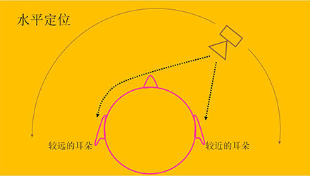垂直定位:垂直定位(失狀面上)發生于聲音進入耳道前,它是通過耳廓對聲音的反射和共振實現的。反射既能使聲波相互抵消,也能加強形成峰值,這取決于聲源離頭顱的垂直距離。垂直定位的作用多體現在5kHz以上的高頻,因為引起反射和共振的波長要足夠短,并與耳廓大小相匹配。