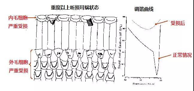 此類型患者耳蝸外毛細胞消失殆盡(60dBHL聽損作為判斷外毛細胞是否存活的分水嶺,詳見中重度聽損患者建議一文),內毛細胞不同程度缺失,聽調諧曲線失去敏感專一性,此時一味追求聲放大,則易產生偏頻聆聽(Off-Frequency Listening)、失真感以及噪聲環境下言語識別率差。