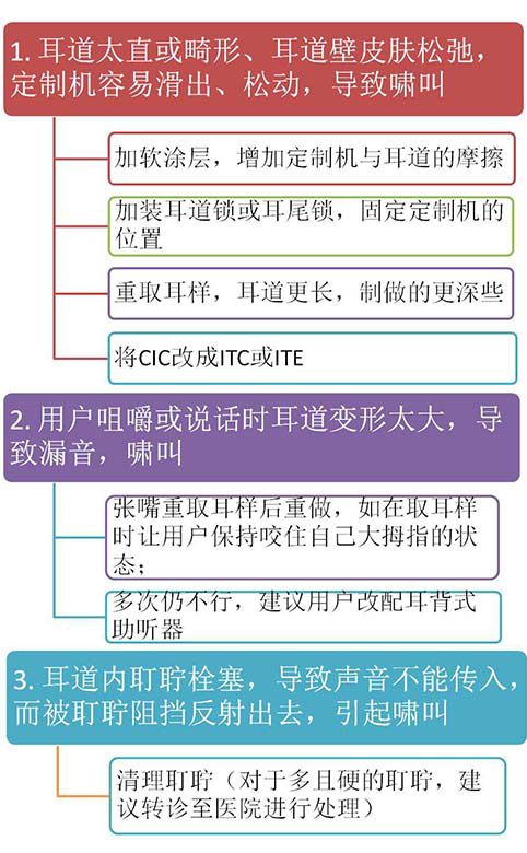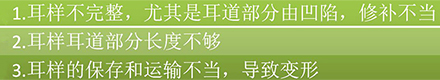 助聽器的嘯叫一直是困擾用戶和驗配師的主要問題之一,其中定制機的嘯叫問題尤其突出。</p><p> 定制機是根據病人的聽力狀況和耳道形狀定制的,每一臺的制作都是獨一無二的,因此出現嘯叫的原因也比標準制作過程的耳背式助聽器復雜得多,有些定制機甚至多次重做仍然不能排除嘯叫。</p><p> 但無論如何只要我們客觀、理智地對待嘯叫問題,找出癥結之所在,對癥下藥,那么減少甚至避免嘯叫的也并非難事。</p><p> 什么是嘯叫?</p><p> 所謂嘯叫就是助聽器發出刺耳的連續尖叫聲,術語上我們稱之為聲反饋,它可能是聲音反饋或電路上的正反饋。</p><p> </p><center><img alt="" src="/upfiles/201905070200484006.png" width="440" height="250" /></center><p></p><p> 內部嘯叫和外部嘯叫</p><p> 嘯叫分內部嘯叫和外部嘯叫兩種。外部嘯叫主要是定制機外殼或耳背機耳模與耳道不密封引起的,而其它原因引起的嘯叫可稱為內部嘯叫。</p><p> </p><center><img alt="" src="/upfiles/201905070200528641.png" width="440" height="250" /></center><p></p><p> 區分內部嘯叫和外部嘯叫</p><p> 區分內部和外部嘯叫時必須用聽筒,驗配師用聽筒連接到用戶反映有嘯叫的助聽器的出聲孔,可用橡皮泥密封接口和通氣孔,不使聲音泄漏出來,然后從聽筒內聽助聽器的輸出聲,若仍有嘯叫則說明助聽器有內部嘯叫,否則說明助聽器只有外部嘯叫。</p><p> 內部嘯叫的原因和排除</p><p> 內部嘯叫的主要原因有:</p><p> </p><center><img alt="" src="/upfiles/20190507020058626.png" width="440" height="250" /></center><p></p><p> 為了防止助聽器出現內部嘯叫,除了助聽器廠家對產品制作和檢驗把好關,對于驗配師和用戶來說,需要特別注意兩點:</p><p> </p><center><img alt="" src="/upfiles/201905070201041323.png" width="440" height="100" /></center><p></p><p> 外部嘯叫的原因和排除</p><p> 絕大部分用戶抱怨的定制機嘯叫是指外部嘯叫,外部嘯叫的原因和處理方法非常復雜,從定制機的整個驗配過程來看,我們可以將這些根原歸納到下面四大類:</p><p> 1.耳道</p><p> 耳道的客觀情況是產生嘯叫的主要原因,其可能引起嘯叫的原因及解決方法如下:</p><p> </p><center><img alt="" src="/upfiles/201905070201091323.png" width="482" height="780" /></center><p></p><p> 2.耳樣(印模)</p><p> 耳樣是定制機外殼制作的原型,耳樣的好壞直接影響到外殼完成后的密封性和舒適度,病人的聽力損失越重,對耳樣的要求也越高。在耳樣這一環節的如下情況將導致定制機嘯叫:</p><p> </p><center><img alt="" src="/upfiles/201905070201157387.png" width="440" height="80" /></center><p></p><p> 取耳樣是驗配師的基本功,必須在充分檢查耳道基礎上,膽大心細地取到合格的耳樣。</p><p> 3.選配和調試</p><p> </p><center><img alt="" src="/upfiles/201905070201216863.png" width="440" height="250" /></center><p></p><p> 選配最重要的就是做好外形和功率的平衡,不要為拉定單而勉強選配,如果用戶需要加大音量至幾乎滿檔才能使用,就容易出現嘯叫。</p><p> 助聽器增益設置(通過音量電位器或驗配軟件設置)的理想位置應該是在滿檔增益的二分之一到三分之二之間。</p><p> </p><center><img alt="" src="/upfiles/201905070201277561.png" width="440" height="250" /></center><p></p><p> 任何機型都有其選配范圍,如果超出此選配范圍,要讓助聽器始終在滿負荷下工作,即使沒有嘯叫,助聽器的失真、噪音等也會增加很多。</p><p> 因此選配合適的機型、線路和矩陣比重做外殼更合理、有效。</p><p> </p><center><img alt="" src="/upfiles/201905070201336863.png" width="440" height="250" /></center><p></p><p> 需要特別注意的是:價格單上的參考驗配范圍是指中高頻的值,但低頻一般會低20dB 左右,所以僅僅平均增益小于參考驗配范圍并不能保證每個頻率點都在驗配范圍內。</p><p> 加通氣孔是讓病人配戴更舒適的方法之一,但有時它也是產生嘯叫的禍首,此時減小甚至于堵塞通氣孔往往能立竿見影。堵塞氣孔可以用棉花或印模膏。</p><p> 對于一些中高檔機型帶反饋抑制功能的線路,可以設置反饋抑制的力度更大,一些輕微的嘯叫就能立刻消除。</p><p> </p><center><img alt="" src="/upfiles/201905070201384912.png" width="440" height="120" /></center><p></p><p> 4.制作</p><p> 關于定制機制作中避免外部嘯叫主要是助聽器廠家工程師需要嚴格把關,如果僅僅是定制機和耳道有輕微的不密封,可以加涂光亮漆或軟涂層處理,現場的維修中心技術員可以提供這一快速服務。</p><p> 需要重做時,必須由經驗豐富的制作人員綜合驗配師提供的信息和上次制作的記錄作出針對性措施。例如增加膨脹系數、加厚密封圈、加深耳道、調整出聲孔方向等。</p><p> 總之,定制機產生嘯叫的原因是多種多樣的,從取耳樣、選線路與矩陣直至制作,最后到調試和配戴,每一個環節處理不好都有可能產生嘯叫,只有抓好每個細節,才能最大可能地滿足病人,提高選配的成功率。</p><p> 更多詳情請登錄聽覺有道助聽器m.chisha.net.cn</p>" />