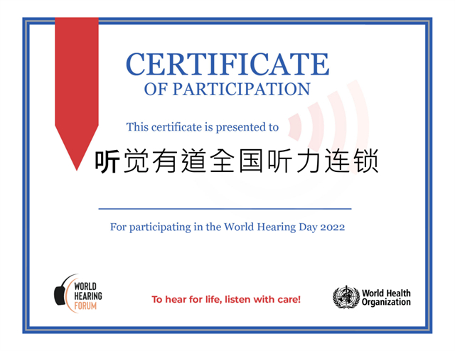 5月10日,聽覺有道獲世界衛生組織WHO授予榮譽證書。
