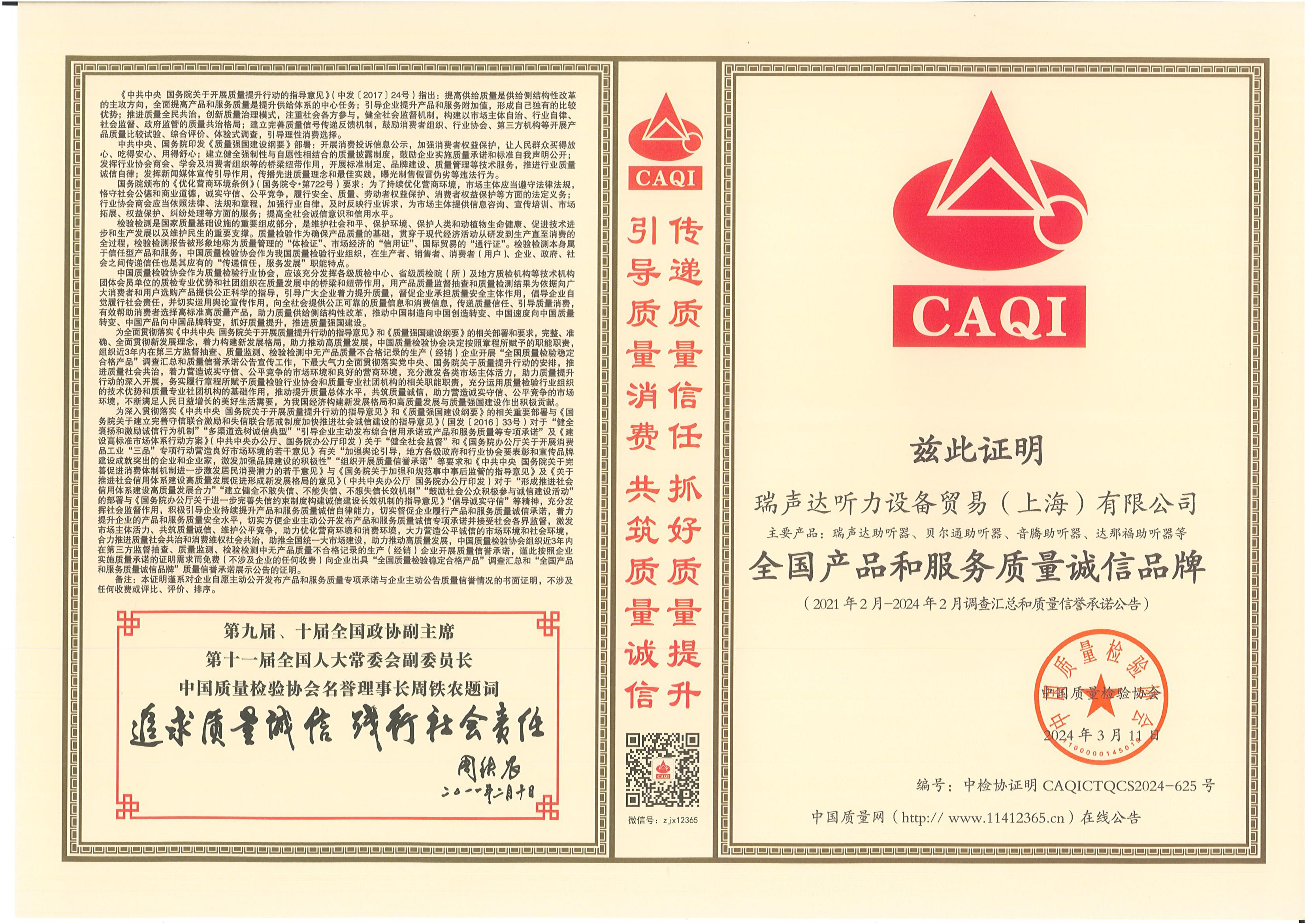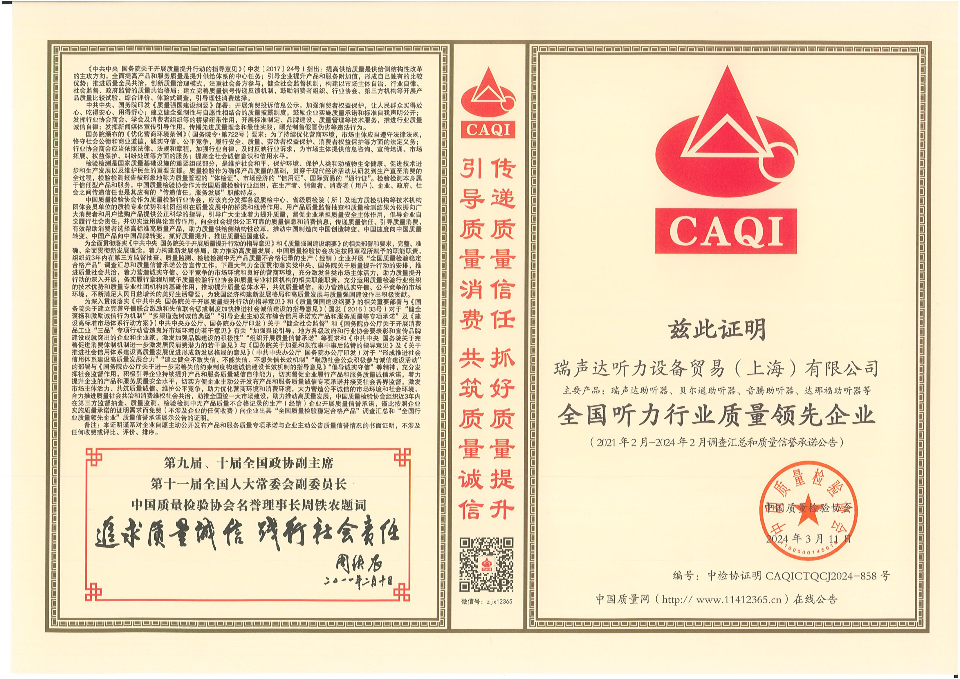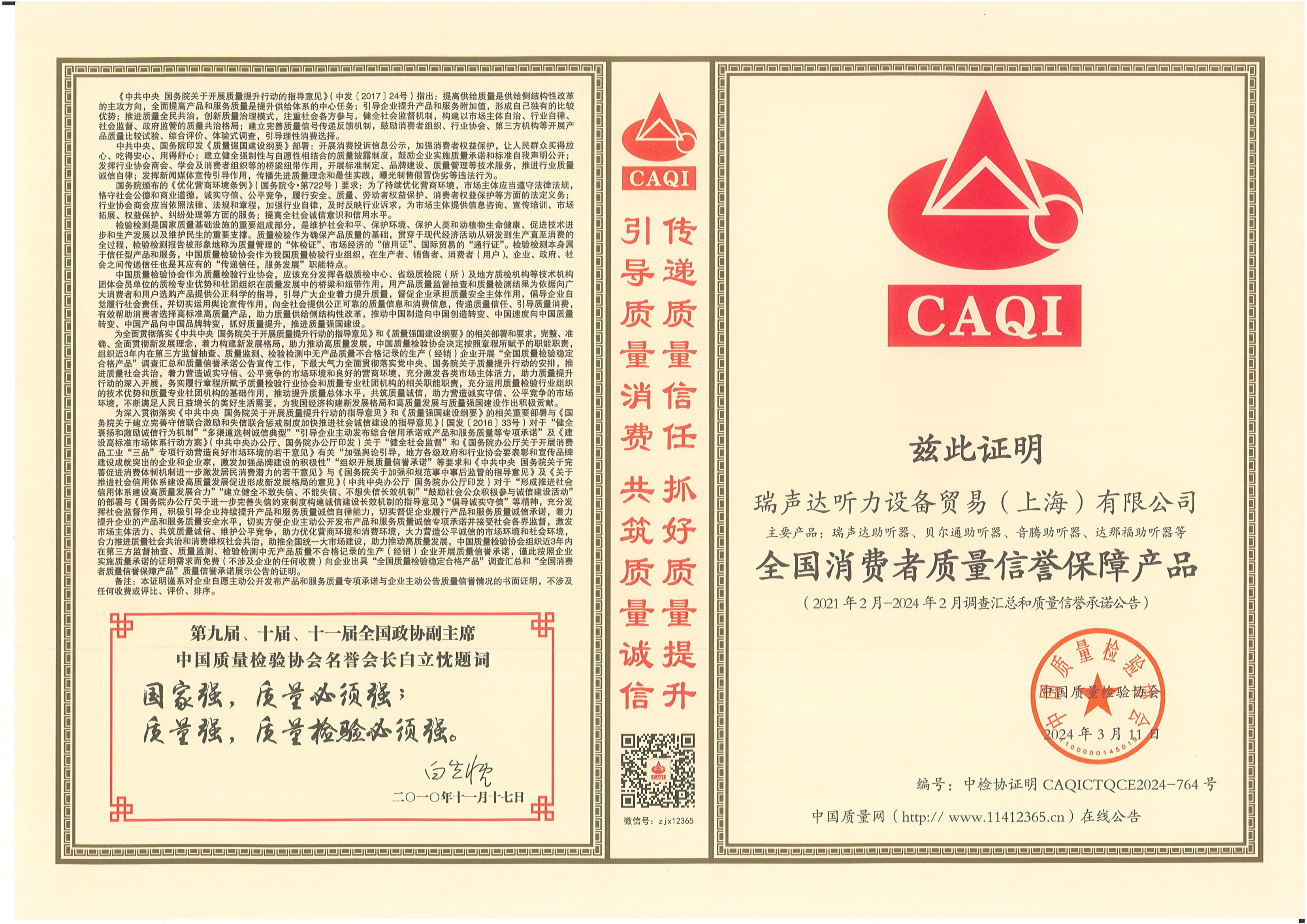 <span style="white-space:pre"> </span>2024年3月15日,是第42個(gè)國(guó)際消費(fèi)者權(quán)益日,是全體消費(fèi)者的共同節(jié)日。今年全國(guó)消協(xié)組織消費(fèi)維權(quán)年主題是“激發(fā)消費(fèi)活力”。<br /><br /> 作為對(duì)貝爾通助聽器產(chǎn)品的肯定,2024年中國(guó)質(zhì)量檢驗(yàn)協(xié)會(huì)再次頒發(fā)了四項(xiàng)榮譽(yù)證書,以期能引導(dǎo)用戶選擇高標(biāo)準(zhǔn)高質(zhì)量的產(chǎn)品,優(yōu)化消費(fèi)環(huán)境,保護(hù)消費(fèi)者權(quán)益。<br /></span><div style="text-align: center;"><br /></div><div style="text-align: center;"> 全國(guó)產(chǎn)品和服務(wù)質(zhì)量誠(chéng)信示范企業(yè)</div><p style="text-align: center;"><span style="font-size:16px;"><img src="/upfiles/202403150116348998.jpg" width="640" alt="" /><br /></span></p><p style="text-align: center;"><span style="font-size:16px;"> 全國(guó)聽力行業(yè)質(zhì)量領(lǐng)先企業(yè)</span></p><p style="text-align: center;"><span style="font-size:16px;"><img src="/upfiles/202403150116524189.jpg" width="640" alt="" /><br /></span></p><span style="font-size:16px;"></span><div style="text-align: center;"><br /></div><p style="text-align: center;"><span style="font-size:16px;"> 全國(guó)消費(fèi)者質(zhì)量信譽(yù)保障產(chǎn)品</span></p><p style="text-align: center;"><span style="font-size:16px;"><img src="/upfiles/202403150117168442.jpg" width="640" alt="" /><br /></span></p><span style="font-size:16px;"></span><div style="text-align: center;"><br /></div><p style="text-align: center;"><span style="font-size:16px;"> 全國(guó)產(chǎn)品和服務(wù)質(zhì)量誠(chéng)信品牌</span></p><p style="text-align: center;"><span style="font-size:16px;"><img src="/upfiles/202403150117523284.jpg" width="640" alt="" /><br /></span></p><span style="font-size:16px;"><br /> 中國(guó)質(zhì)量檢驗(yàn)協(xié)會(huì)是國(guó)家市場(chǎng)監(jiān)督管理總局主管下的質(zhì)量檢驗(yàn)行業(yè)組織和質(zhì)量專業(yè)機(jī)構(gòu),為充分發(fā)揮名優(yōu)企業(yè)、消費(fèi)者之間的橋梁和紐帶作用,向廣大消費(fèi)者提供權(quán)威可靠的質(zhì)量信息,切實(shí)維護(hù)廣大名優(yōu)產(chǎn)品生產(chǎn)企業(yè)及消費(fèi)者的合法權(quán)益。<br /><br /> 中國(guó)質(zhì)量檢驗(yàn)協(xié)會(huì)連續(xù)多年頒發(fā)榮譽(yù)證書,不僅代表著對(duì)貝爾通助聽器產(chǎn)品質(zhì)量的肯定,這同時(shí)也是一份承諾和職責(zé),督促著我們持續(xù)為聽損用戶提供優(yōu)質(zhì)的產(chǎn)品和服務(wù)!</span>" />