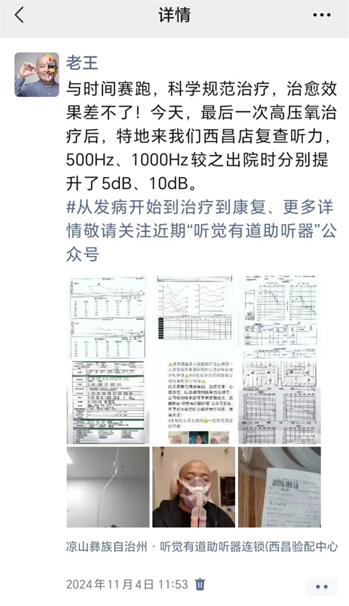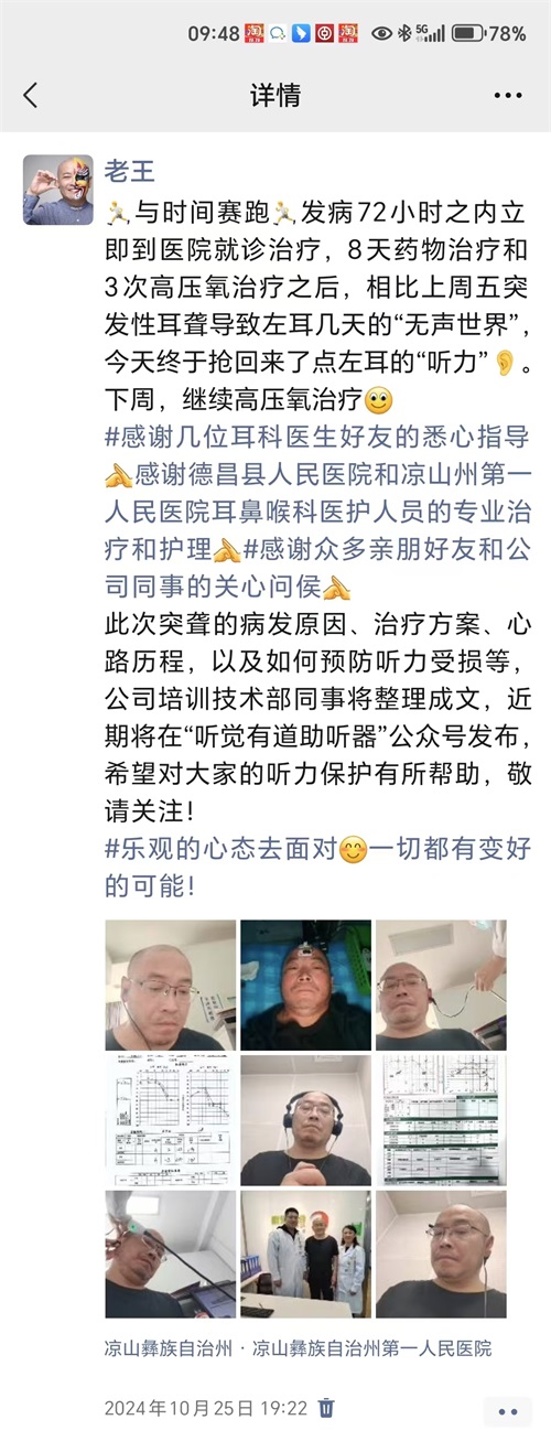 在這個(gè)快節(jié)奏的世界里,每一個(gè)細(xì)微的聲音都承載著生活的溫度。然而,突如其來的聽力挑戰(zhàn),卻讓這份美好變得模糊。<br /><br /><br />聽覺有道全國聽力連鎖聯(lián)合創(chuàng)始人王曉剛先生,期間或因工作過度操勞,于2024年10月16日的夜晚,耳道內(nèi)突然響起了一聲“砰”的異響。次日,他的耳內(nèi)又相繼出現(xiàn)了“噗噗”聲、“滋滋”聲的雜音,與人交談時(shí),聽不清、甚至聽不到對(duì)方的話語變得愈發(fā)顯著。<br /><br /></span><p><span style="font-size:16px;">以下任何一項(xiàng)癥狀單獨(dú)或突發(fā)性耳聾的發(fā)病原因及發(fā)病機(jī)制尚不明確,多認(rèn)為與病毒感染、腫瘤性病變、自身免疫疾病、藥物中毒內(nèi)耳缺血等因素相關(guān)。<br />過度勞累,焦慮、精神壓力及相關(guān)心理因素等被認(rèn)為是常見的誘發(fā)因素。伴隨出現(xiàn),均有可能是突發(fā)性聾:<br />1、突然發(fā)生的主觀聽力下降(但是根據(jù)聽力損失的程度以及頻率不同,不是所有的病人都有聽力下降的感覺)<br /><br /><br />2、耳鳴(約90%)<br /><br /><br />3、耳悶脹感(50%以上)<br /><br /><br />4、眩暈、惡心、嘔吐(30%~50%)<br /><br /><br />5、聽覺過敏或重振(表現(xiàn)為對(duì)聲音異常敏感或者異常遲鈍,導(dǎo)致刺耳感或者失真感)<br /><br /><br />6、耳周感覺異常:(如麻木感、針刺感等不適感覺(全聾患者常見))<br /></span></p><p><span style="font-size:16px;">18日下午,當(dāng)他嘗試堵住右耳,竟發(fā)現(xiàn)左耳幾乎無法捕捉到外界的任何聲響。此刻,王總深刻意識(shí)到,自己的聽力出現(xiàn)了嚴(yán)重問題,于是立即趕往當(dāng)?shù)蒯t(yī)院耳鼻喉科進(jìn)行檢查,最終被確診為突發(fā)性耳聾。</span></p><p><br /></p><p style="text-align: center;"><img src="/upfiles/202411140426063076.jpg" alt="" /><br /></p><p><br /></p><p><span style="font-size:16px;">回想起發(fā)病初期,王總表示,當(dāng)自己突然失去聽力,完全與外界隔絕的那一刻,內(nèi)心充滿了無助與恐懼。幸運(yùn)的是,由于他長(zhǎng)期深耕聽力行業(yè),對(duì)聽力受損有著較為深入的了解、明白:突聾聽力救治時(shí)間為黃金72小時(shí)內(nèi)。因此能夠識(shí)別癥狀并及時(shí)就醫(yī),從而得到了有效的治療。<br /><br /><br />然而,如今仍有許多患者對(duì)聽力健康的信息了解不足,錯(cuò)過了最佳的治療時(shí)機(jī),最終形成不可逆的聽力損傷,給日常生活、工作中帶來嚴(yán)重交流障礙。</span><br /></p><p><br /></p><p style="text-align: center;"><img src="/upfiles/202411140428078193.jpg" alt="" /><br /></p><p style="text-align: center;"><img src="/upfiles/202411140429087669.jpg" alt="" /><br /></p><p style="text-align: center;"><img src="/upfiles/202411140429178890.png" alt="" /><br /></p><p style="text-align: center;"><br /></p><p style="text-align: center;"><span style="font-size:16px;color:#ff9900;"><strong>什么是突發(fā)性耳聾?</strong></span></p><p style="text-align: center;"></p><div style="text-align: left;"><span style="font-size:16px;">醫(yī)學(xué)全名:突發(fā)性不明原因性聽力損失。</span></div><span style="font-size:16px;"></span><div style="text-align: left;"><br /></div><div style="text-align: left;"><br /></div><div style="text-align: left;">簡(jiǎn)稱:突聾</div><div style="text-align: left;"><br /></div><div style="text-align: left;"><br /></div><div style="text-align: left;">根據(jù)中國2015年版《突發(fā)性聾診斷和治療指南》,突發(fā)性耳聾目前定義為:是指72小時(shí)內(nèi)突然發(fā)生、原因不明的感音神經(jīng)性聽力損失,至少在相鄰的兩個(gè)頻率聽力下降≥20dBHL。</div><div style="text-align: left;"><br /></div><div style="text-align: left;"><br /></div><div style="text-align: left;">近年來“突發(fā)性耳聾”患者年輕化趨勢(shì)明顯,年輕人患病比例增加了三至四成。耳蝸中的聽覺毛細(xì)胞一旦受損,在一定時(shí)間內(nèi)得不到及時(shí)治療,將不能再生。</div><div style="text-align: left;"><br /></div><div style="text-align: left;"><br /></div><div style="text-align: center;"><strong><span style="color:#ff9900;">臨床表現(xiàn)</span></strong></div><p></p><p><span style="font-size:16px;">突聾一般單側(cè)發(fā)病,個(gè)別情況下可以雙側(cè)發(fā)病( 1/10雙側(cè));</span><br /></p><p><span style="font-size:16px;"><br /></span></p><p style="text-align: center;"><span style="font-size:16px;color:#ff9900;"><strong>原發(fā)狀態(tài)</strong></span></p><p><span style="font-size:16px;">以下任何一項(xiàng)癥狀單獨(dú)或伴隨出現(xiàn),均有可能是突發(fā)性聾:<br />1、突然發(fā)生的主觀聽力下降(但是根據(jù)聽力損失的程度以及頻率不同,不是所有的病人都有聽力下降的感覺)<br /><br /><br />2、耳鳴(約90%)<br /><br /><br />3、耳悶脹感(50%以上)<br /><br /><br />4、眩暈、惡心、嘔吐(30%~50%)<br /><br /><br />5、聽覺過敏或重振(表現(xiàn)為對(duì)聲音異常敏感或者異常遲鈍,導(dǎo)致刺耳感或者失真感)<br /><br /><br />6、耳周感覺異常:(如麻木感、針刺感等不適感覺(全聾患者常見))<br /></span></p><p><span style="font-size:16px;"><br /></span></p><p style="text-align: center;"><span style="font-size:16px;color:#ff9900;"><strong>繼發(fā)狀態(tài)</strong></span></p><p><span style="font-size:16px;">恐懼,焦慮;耳鳴帶來的心理、睡眠干擾等,嚴(yán)重影響生活質(zhì)量。<br /></span></p><p><span style="font-size:16px;"><br /></span></p><p style="text-align: center;"><span s