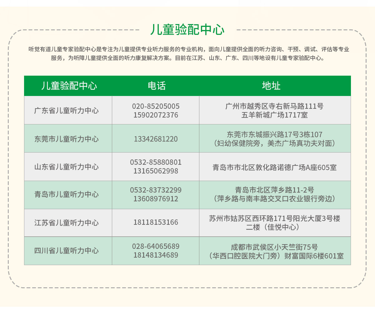聽覺有道兒童專家驗配中心是專注為兒童提供專業(yè)聽力服務(wù)的專業(yè)機(jī)構(gòu),面向兒童提供全面的聽力咨詢、干預(yù)、調(diào)試、評估等專業(yè)服務(wù),為聽障兒童提供全面的聽力康復(fù)解決方案。目前在江蘇、山東、廣東、四川等地設(shè)有兒童專家驗配中心。